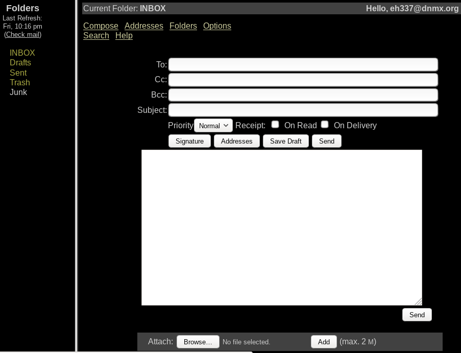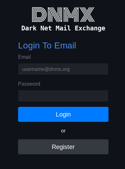 Dark Net Mail Exchange es un servicio de correo electrónico de uso gratuito ellos dicen que no les importa quién eres tu y nunca te pediran información ni revelaran algo de tu identidad. Pero También dicen que no deberían confiar en ellos, ni en ningún servicio de la red oscura, además recomiendan encarecidamente que utilices el cifrado PGP para enviar información confidencial.