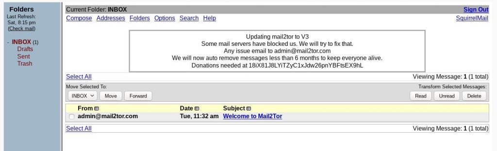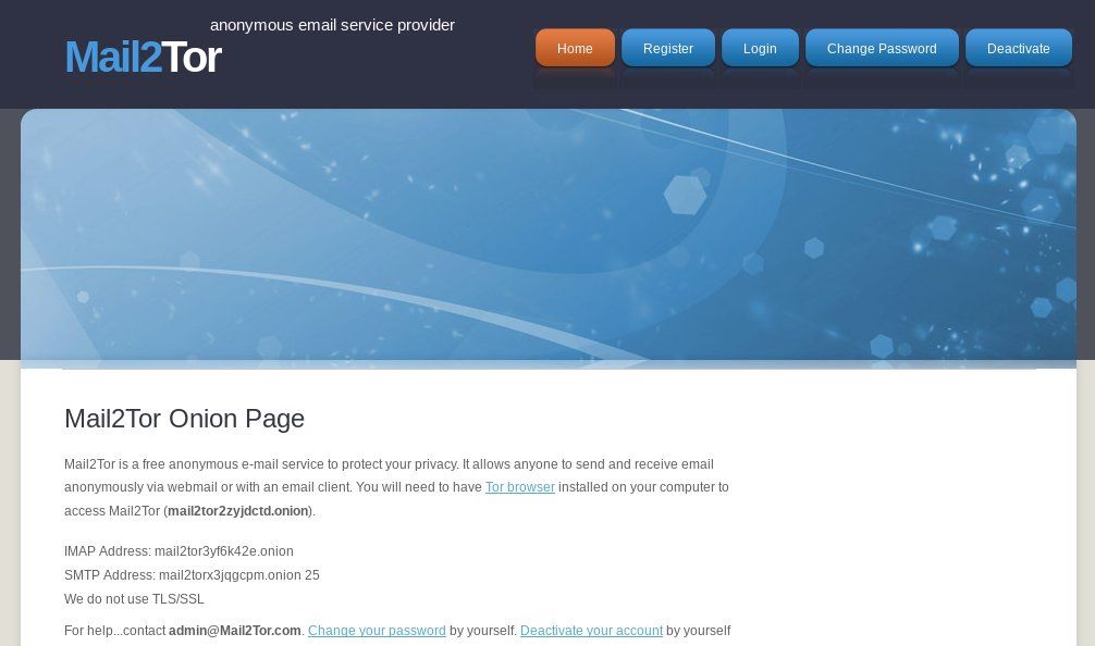 Mail2Tor es un servicio de correo electrónico anónimo gratuito, para proteger tu privacidad, es su slogan. Permite a cualquier persona enviar y recibir correos electrónicos de forma anónima a través de webmail o con un cliente. su plataforma web utiliza una interfaz SquirrelMail, permite IMAP y SMTP, pero no soporta TLS / SSL.