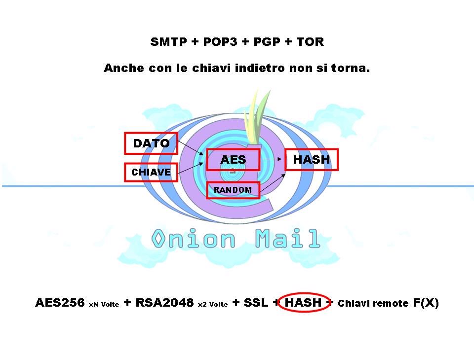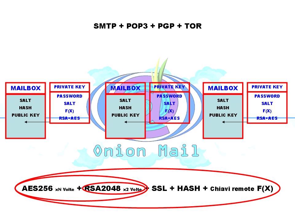 Todos los archivos, usuarios y bandejas de entrada se cifran a través de algoritmo hash de forma calculada de clave móvil y algunas claves de servidor. La clave maestra del servidor no está en el servidor: Cuando se inicia un servidor OnionMail, negocia alguna función F (X) con otros servidores. Las claves se cortan, cifran y calculan a partir de una gran cantidad de F (X) distribuidas en la red TOR. Todos los F (X) están controlados por certificados KCTL de autodestrucción. El certificado de autodestrucción puede activar, desactivar o destruir las claves en todos los nodos F (X) sin acceder al servidor original de OnionMail. Esto proporciona la capacidad de eliminar las claves del servidor en caso de robo o incautación sin requerir acceso al servidor.