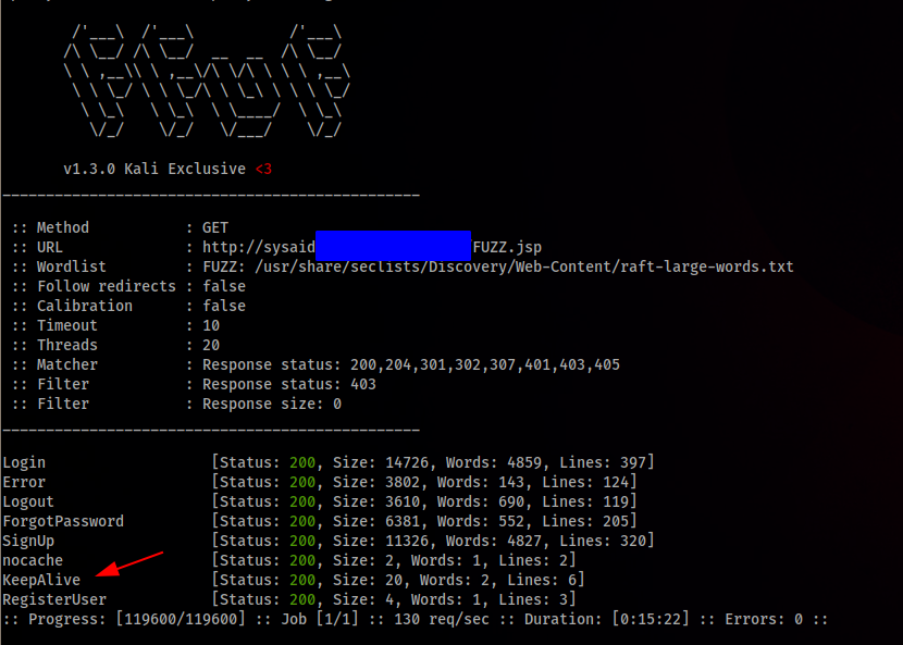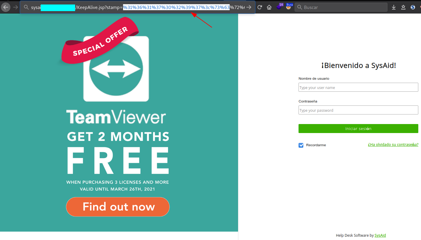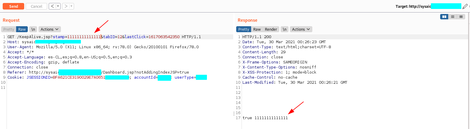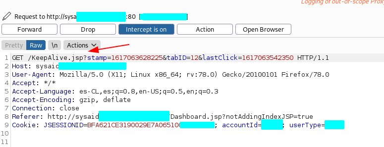 Every so often the application verifies the validation of the session through the KeepAlive.jsp script, this was checked through the proxy with Burp Suite.