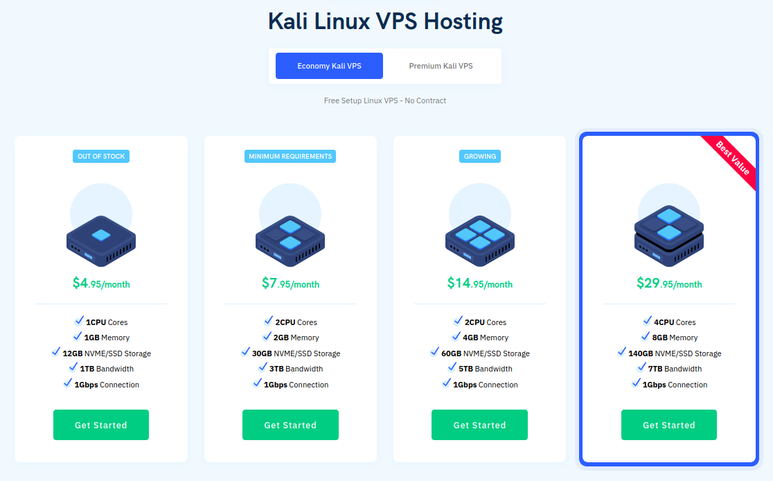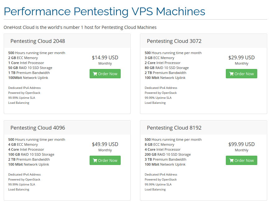 La empresa OneHost Cloud provee un servicio que le denomina Pentesting VPS, como sistema operativo puedes optar por Kali Linux, Backbox o ParrotOS, las versiones disponibles no son las últimas, pero si las previas. Todos los planes tienen un límite mensual de 500 horas de uso que puede volverse ilimitado por un monto mensual adicional, las tarjetas de red son de 100Mbit y el ancho de banda es limitado, su capacidad máxima depende de cada plan el acceso gráfico es por RDP.