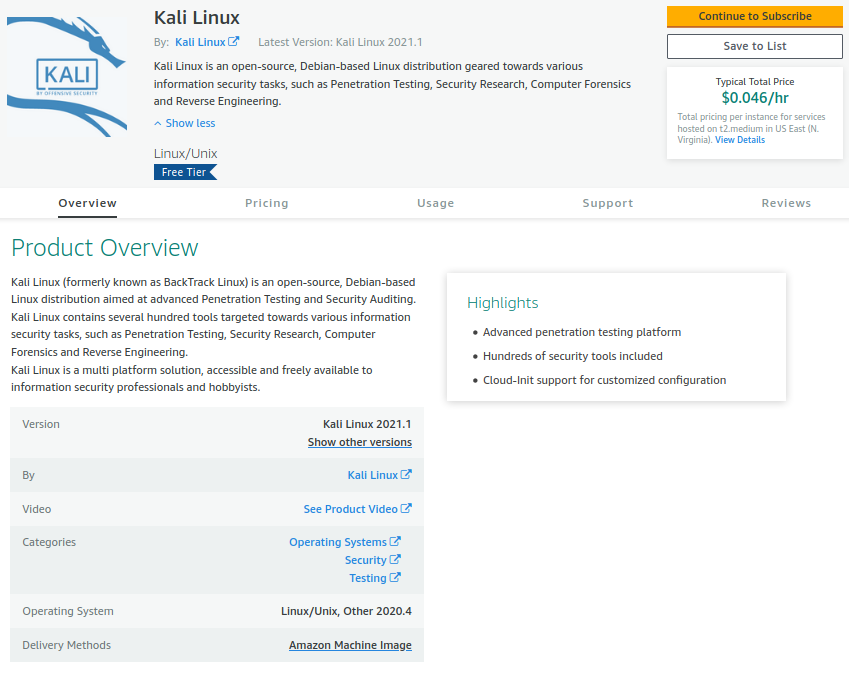 Para los amantes de AWS también existe una alternativa por hora, con un costo en dólares estimado de $0.046 EC2/hr, puedes levantar una instancia de Kali Linux 2021.1 en Amazon Cloud, esto es posible porque existe una imagen de la máquina en Amazon (AMI), disponible en Amazon Marketplace.