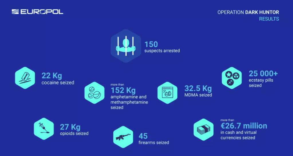 En septiembre del 2020, tras 9 meses de colaboración entre agencias policiales de ocho países, compartiendo información e inteligencia, logran capturan a 179 vendedores de opioides de la Darknet, la operación denominada DisrupTor resultó en la incautación en EEUU de más de $6.5 millones en efectivo y criptomonedas; aproximadamente 500 kilogramos de drogas en todo el mundo como: oxicodona, fentanilo, hidrocodona, heroína, metanfetamina, cocaína y éxtasis, así como medicamentos que contienen sustancias adictivas y 63 armas de fuego. La principal fuente de inteligencia para esta operación se obtuvo a partir del derribo de Wall Street Market realizado en mayo de 2019.