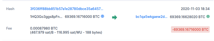 Según un informe de CipherTrace, empresa dedicada a realizar inteligencia sobre la blockchain, esta dirección esta relacionada a actividades de la extinta Silk Road. Previamente a la transacción anterior se movió 1 BTC, CipherTrace sugiere que esta sirvió como prueba.