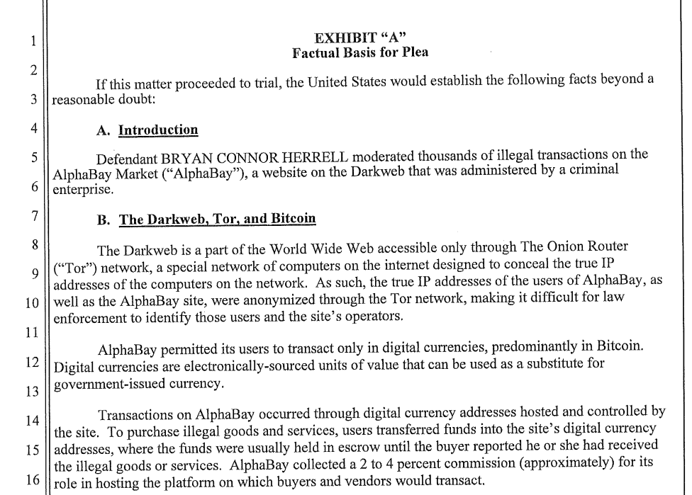 Bryan Connor Herrell, de 26 años, de Aurora, Colorado, fue sentenciado hace unos días por el juez de la corte de distrito de los Estados Unidos, a 11 años de prisión. Según los documentos judiciales, Herrell moderaba disputas en la plataforma, también monitoreaba los intentos de estafa a los usuarios de AlphaBay. «Penissmith» y «Botah» eran los alias utilizados por Herrell. El pagó por su servicios eran obviamente en Bitcoin.